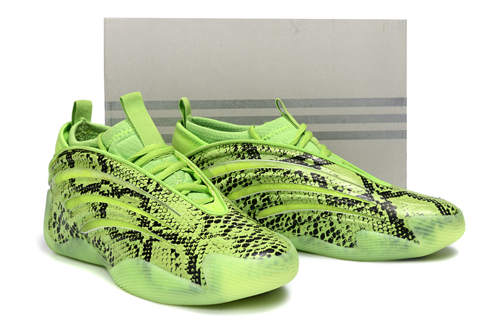 Модель Harden Vol. 9 “Snakeskin” выполнена в ярком солнечно-зелёном цвете (“Solar Slime”) с чёрным змеиным принтом, что придаёт ей агрессивный и уникальный внешний вид. Этот стиль подчёркивает непредсказуемость и смертоносность игры Хардена, вдохновляя игроков чувствовать себя уверенно и выделяться на паркете.