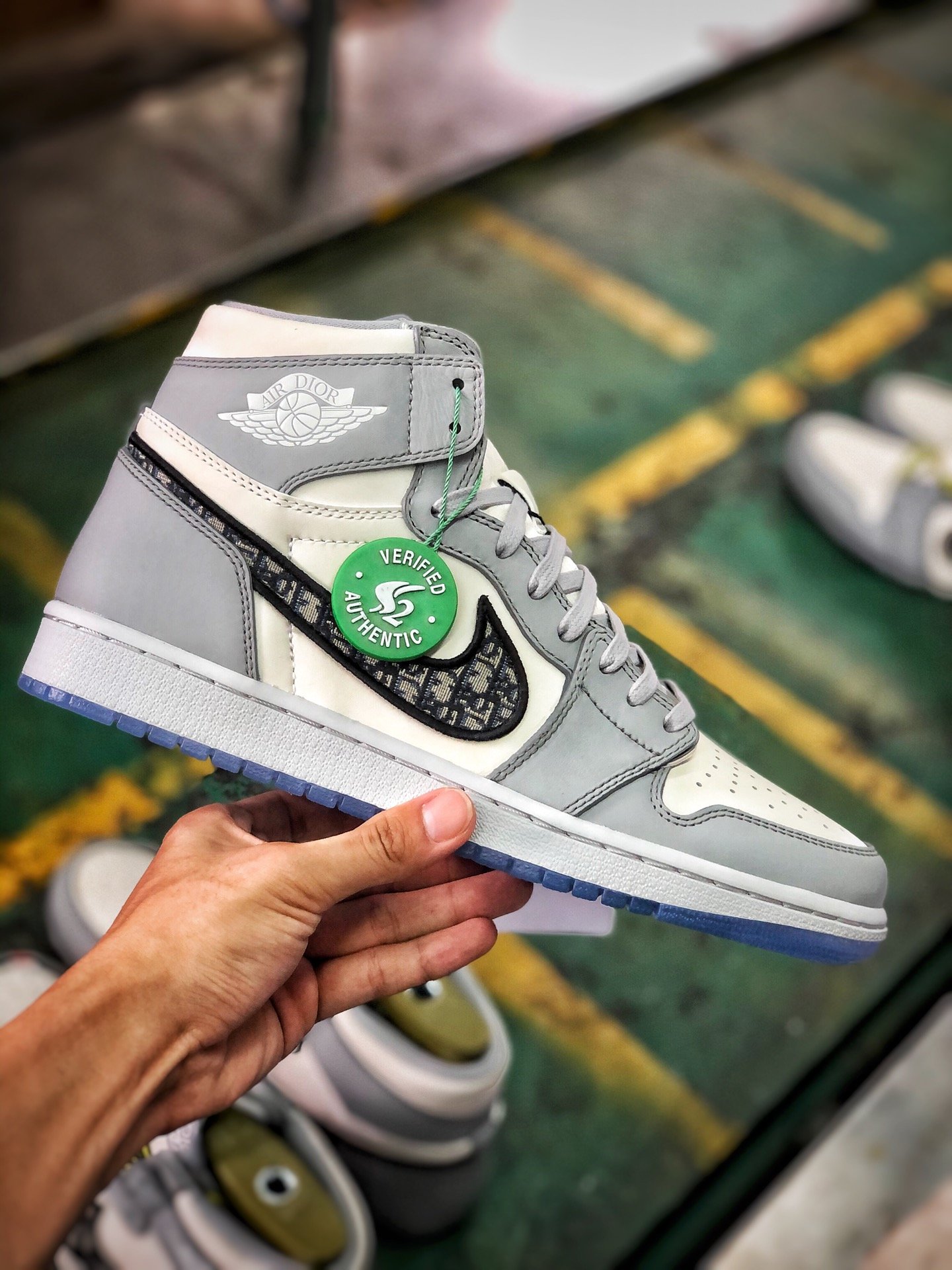 Полупрозрачная резиновая подошва под которой виднеются надписи «DIOR» и «AIR DIOR» c логотипом Jumpman Wings завершают дизайн этой коллаборации кроссовок.